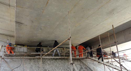 首先我司工作人員對鎮(zhèn)江路段橋梁的跨距、每跨的梁片數(shù)、梁片的結構形式以及橋梁的高度進行現(xiàn)場現(xiàn)場勘察。并查看相關圖紙核實橋梁縱向連續(xù)梁片數(shù),從而初步計算出梁體重量及荷載能力。然后經(jīng)過測量梁片與墩臺之間的實際距離,研究放置千斤頂?shù)奈恢眉芭R時支撐位置。討論現(xiàn)場施工操作人員、觀察人員的位置以及整個施工環(huán)境。