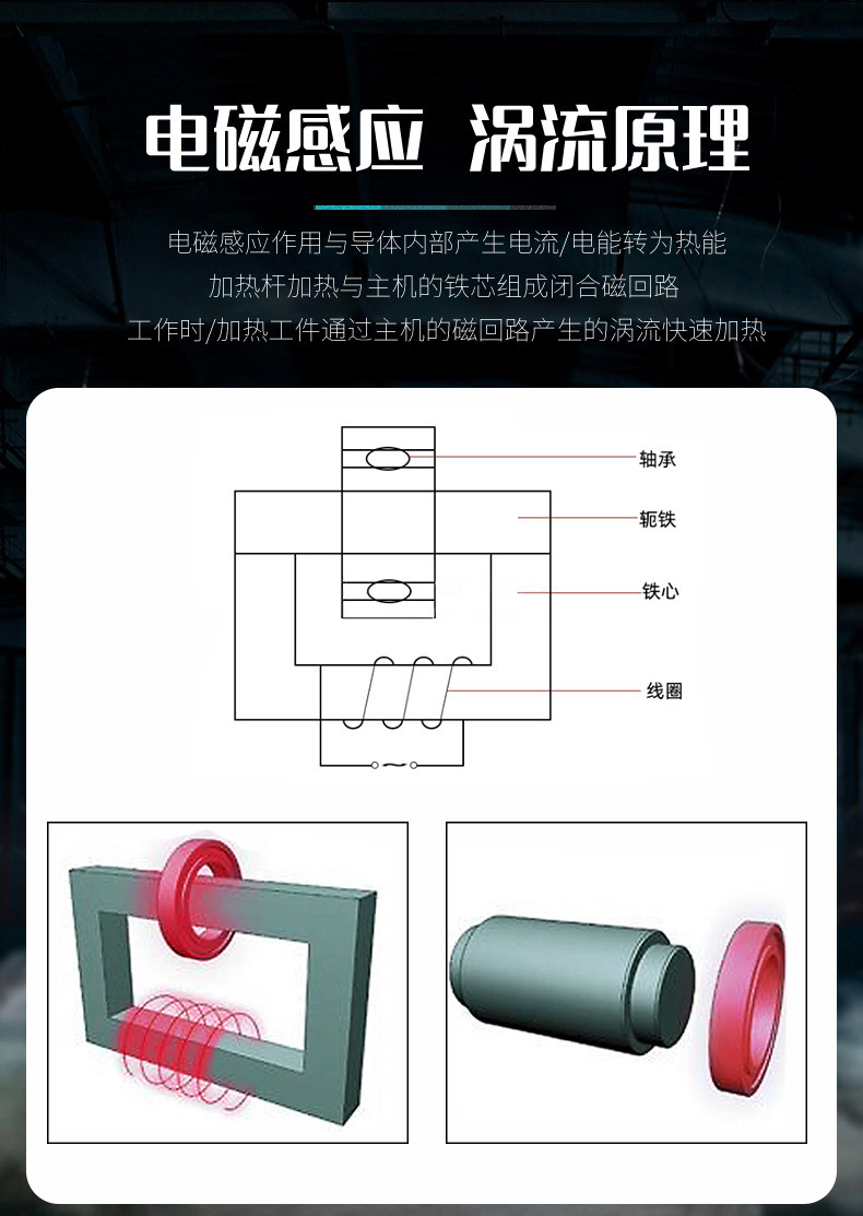 4、被加熱工件放置到主機(jī)鐵蕊中間活動(dòng)軛鐵的下面,輕輕向下移動(dòng),使之與工件吻合(若工件厚度尺寸不變,可調(diào)節(jié)主機(jī)后杠桿橋下面的定位螺釘,使軛鐵與工件保持2mm的間距,以方便連續(xù)操作)。至此,調(diào)試結(jié)束,可投入使用。